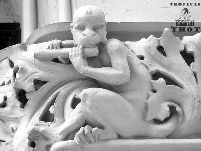 Dos amigos les acompañan: un mono que ameniza tal esfuerzo tocando un pequeño instrumento de viento y otro que, ajeno a todo, come un racimo de uvas.